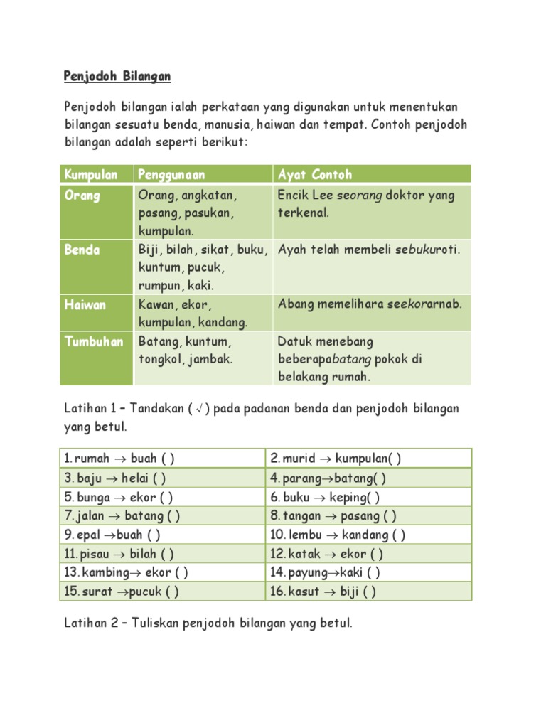Kebelakangan ini telah wujud penjodoh bilangan yang menggunakan benda. Latihan 2 Tuliskan penjodoh bilangan yang betul. Berikut ialah senarai penjodoh bilangankegunaandan ayat contoh.